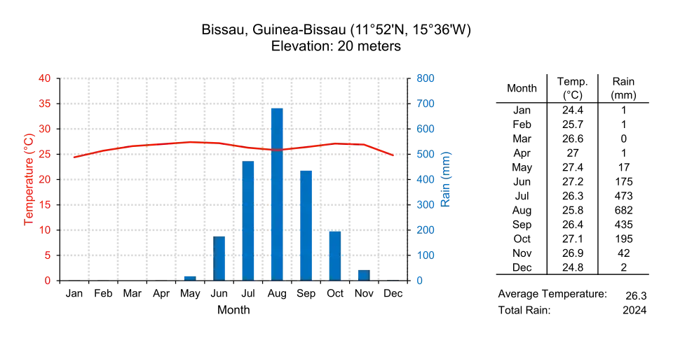 - ^ "Bissau Climate Guide". Centro de Investigaciones Fitosociológicas. Archived from the original on 2007-08-07. Retrieved 2011-10-04.