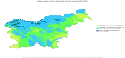 Humid subtropical climate (Cfa) on the coast, oceanic climate (Cfb) in most of Slovenia, continental climate with mild to hot summers and cold winters (Dfb) in the plateaus and mountains on the north, subpolar (Dfc) and tundra (ET) climate above the treeline on the highest mountain peaks. Precipitation is high away from the coast, with the spring being particularly prone to rainfall. Slovenia's Alps have frequent snowfalls during the winter.[4][5]