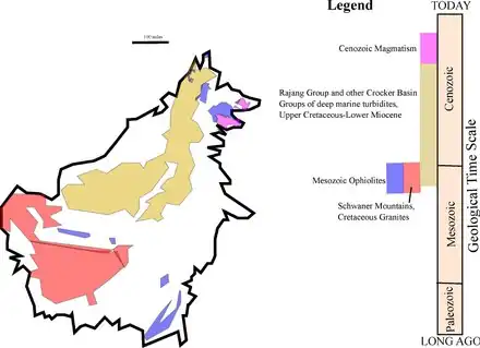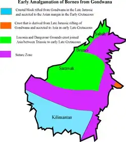 There are many crustal fragments in northeast Borneo that are derived from Mesozoic ophiolites placed during the initiation of the western Pacific Ocean plate subducting beneath southeast China and southeast Asia.[6] This ophiolite basement underlies regions from Sabah in northeast Borneo and the Meratus Mountains in southeast Borneo. The ophiolite crustal fragments were also emplaced in Central Java to the south of Borneo and Palawan and the Philippines in the North.[6]