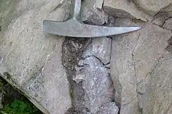 - ^ Gaize (German: Pläner) is a historical or traditional summary term for some marine sedimentary rocks of the Upper Cretaceous, especially the Cenomanian and Turonian of Central Europe and the Baltic States. In modern geological classifications, the word can only be found as part of the name of some lithostratigraphic units, not as a sedimentary petrographic term. Gaize has a relatively well-bedded structure with layer thicknesses of a few millimetres to a maximum of about 1.5 metres. This distinctive stratification has influenced mining of split slabs, blocks or broken material for lime burning. The main mineral constituents of gaize are quartz, calcite, clay minerals and mica (mainly glauconite). Due to the different proportions of the minerals depending on the occurrence, practically the entire range between limestone, quartz sandstone and claystone is covered. The colour of gaizes varies between grey beige and gold beige. In addition, gaize often has a characteristic spotted appearance.
