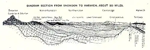 This cross section shows what would be seen in a deep cutting nearly E. and W. across England and Wales. It shows also how, in consequence of the folding of the strata and the cutting off of the uplifted parts, old rocks which should be tens of thousands of feet down are found in borings in East Anglia only 1000 feet or so below the surface.