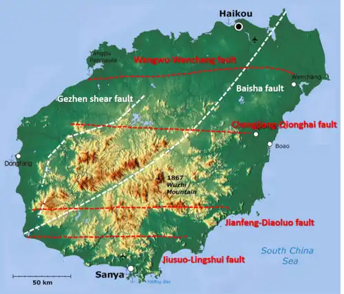 There are dominantly two sets of fault systems that exist on Hainan Island, one set trending east and the other trending northeast.[2] Wangwu-Wenchang fault, Changjiang-Qionghai fault, Jianfeng-Diaoluo fault and Jiusuo-Lingshui fault are the major east-trending faults, while Gezhen shear fault and Baisha fault are the dominant northeast-trending faults on the Island.[1]