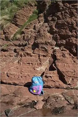 The Eday Group overlies the Rousay Flagstones and represents a change to dominantly fluvial/aeolian deposition with only occasional lacustrine intervals. The Eday Group consists of three sandstone units, the lower, middle and upper Eday Sandstones separated by the Eday Flagstones and Eday Marl respectively. The Eday Marl consists mainly of red and green mudstones and siltstones and is thought to have been deposited in a river floodplain environment.[5] Locally pseudomorphs of halite have been found and rarely marine microfossils (scolecodonts) indicating that the basin was affected by occasional marine incursions at this time.[6]
