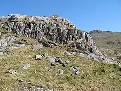 The Clogau Formation, a thickness of black mudstones, together with the late Cambrian age Maentwrog, Ffestiniog Flags and Dolgellau formations are assigned to the Mawddach Group. These too are largely turbidites though the Dolgellau Formation is a dark pyritic mudstone. The exposures of Cambrian age rocks along the park's northwestern boundary differ though the rocks of the lowermost Fachwen Formation can be equated to those of the Dolwen Formation, similarly the Llanberis Slates Formation can be correlated with the rocks of the Llanbedr Formation. The middle Cambrian succession is missing here and the upper Cambrian succession locally comprises the sandstones of the Bronllwyd Grits Formation and the overlying mudstones, siltstones and sandstones of the Marchlyn Formation, correlating with the Ffestiniog Flags. The uppermost part of the Marchlyn, a series of interbedded sandstones and conglomerates, are referred to as the Carnedd y Filiast Grit. An outcrop of this grit at Cwm Graianog displays distinctive ripple-marked bedding on an inclined bedding plane known to rock-climbers as 'Atlantic Slab' (Welsh: Llechen Cytrolar).[6][7][8]