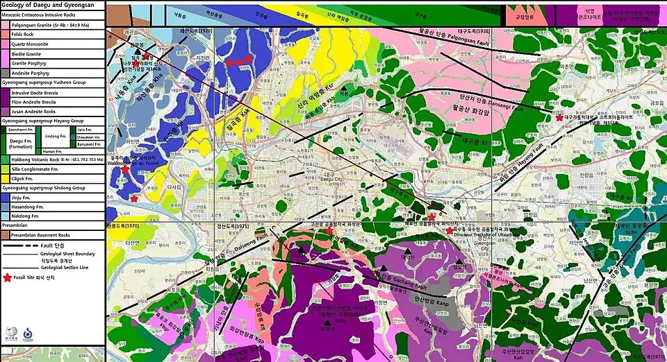 {{cite journal}}: Cite journal requires|journal=(help) - ^ Youngbeom, Cheon (2017). "Geometry and kinematics of fault systems in the Uiseong block of the Gyeongsang Basin, and their roles on the basin evolution (KOR)". 지질학회지. 53 (2). The Geological Society of Korea: 241–264.