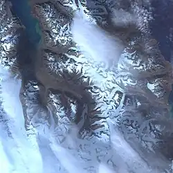 Geological basement dated from Precambrian, Cambrian, Ordovician and Silurian, originally termed Hecla Hoek,[1] is found in three different provinces. The southwestern terrain comprises Prins Karls Forland, Oscar II Land, Nordenskiöld Land west of Grønfjorden and Wedel Jarlsberg Land . The northwestern terrain includes Haakon VII Land and Albert I Land. The northeastern terrain comprises Nordaustlandet and the northeastern parts of Spitsbergen.[2]