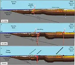 The last and most recent stage in the evolution of the Antarctic Peninsula subduction zone is the opening of the Bransfield Rift,[2][5] creating the Bransfield back-arc basin from the Oligocene to the present day.[2] This basin separates the inner, older magmatic arc (mainland Antarctic Peninsula) from the outer, younger magmatic arc (South Shetland Islands).[9] Alkaline and tholeiitic volcanic activity is associated with this rifting event.