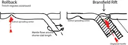 The trenchward migration of the spreading center is attributed to the subduction of the Phoenix Plate under the Antarctic Plate.[2] Slab rollback and South Shetland Trench oceanward retreat have led to extensional forces acting on the leading edge of the overriding plate.[2] The Bransfield Strait, the result of this extension, is presumed to be four million years old or less;[2] magnetic anomalies created by the formation of new basaltic crust[6] and aligned with the axis of the Bransfield Rift[2] indicate that the newly formed oceanic crust in the Bransfield Strait is roughly 1.3 million years old.[2] Unfortunately the deposition of sediments and extensive intrusions into the rift render computer modeling unreliable.[2] Isolated occurrences of terrestrial volcanic activity are present, and are predominantly alkaline to tholeiitic in composition.[6]