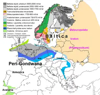 This occurred during the Late Ediacaran and the Early Cambrian when the weakest part of the craton was reactivated. Since then the basin has been deepened mainly through subsidence caused by extensional tectonics.[1] In the northern part of the Baltic Sea basin, including the Gulf of Bothnia and the Bothnian Sea, the depression originated as a series of interconnected rifts that were not active enough to split the East European Craton.[2] Subsidence in the southern parts was most pronounced during a period starting in the Late Ordovician and lasting to Middle Silurian. At this time the Baltic sea basin and the East European Craton were part of a continent and tectonic plate known as Baltica. Baltica collided with the continent Laurentia in the Late Silurian and Early Devonian. This caused compression in the basin in a north-west to south-east direction.
