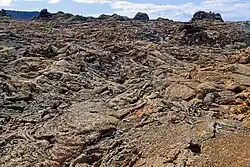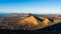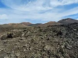 At about 2.7 Ma, in the late Pliocene Epoch, the rejuvenation stage began. It produced much less lava than the earlier shield stage, mainly at the Montaña Roja and Montaña Bermeja volcanoes in southern Lanzarote.[61] Then, throughout the subsequent Pleistocene and Holocene epochs, the rejuvenation volcanism has continued and has been dominated by strombolian-style eruptions of lava from sets of volcanic cones aligned along numerous northeast–southwest fissures in the central part of Lanzarote.[65] Geologically recent examples of Lanzarote's rejuvenation stage volcanism include eruptions at Montaña Corona (about 21,000 years ago), Timanfaya (1730–1736) and Tao/Nuevo del Fuego/Tinguatón (1824).[66][32][67]