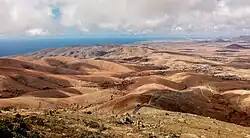 Lanzarote and Fuerteventura are separated by an 11 km-wide (7 mi), 40 m-deep (130 ft) ocean strait. Both islands are parts of a volcanic ridge called the Canary Ridge. These two islands have sometimes been a single island in the past when worldwide sea level was lower than its present level, for example during the Last Glacial Maximum about 20,000 years ago.[9][10] The single island is sometimes referred to as Mahan.[11]