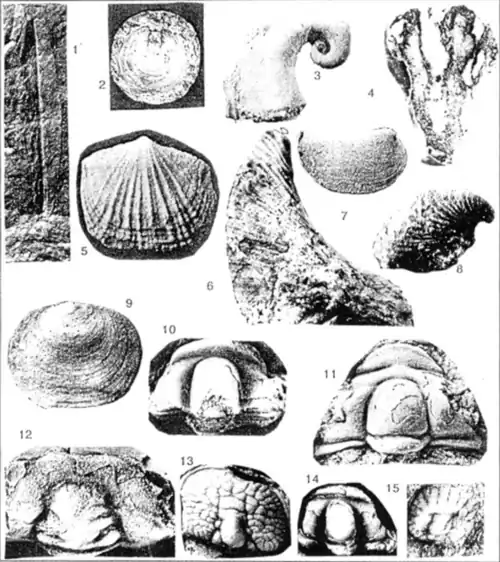 Three species of rostroconchs and six species of gastropods are also present.[12] The rostroconchs are thought to have lived like the clams we see now since they resemble them in terms of appearance but only had one shell.[12] Also discovered was a single species of an orthothecid.[12]