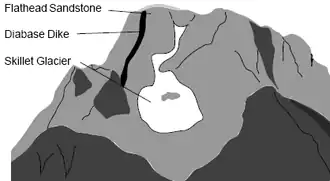 Sometime around 2.5 billion years ago, blobs of magma intruded into the older rock, forming plutons of granitic rock.[3] Extensive exposures of this rock are found in the central part of the range. About 1.3 to 1.4 billion years ago in Late Precambrian, 5-to-200-foot (1.5 to 61.0 m) thick black diabase dikes intruded as well, forming the prominent vertical dikes seen today on the faces of Mount Moran and Middle Teton (the dike on Mount Moran is 150 feet (46 m)).[3][4] Some of the large dikes can be seen from the Jenny Lake and String Lake areas.