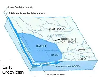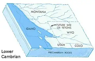 Early in Cambrian time a shallow seaway, called the Cordilleran trough, extended from southern California northeastward across Nevada into Utah and Idaho.[7] The vast gently rolling plain on Precambrian rocks to the east was drained by sluggish westward-flowing rivers that carried sand and mud into the sea. The site of the Teton Range was part of this plain. Slow subsidence of the land caused the sea to spread gradually eastward during Middle Cambrian time flooding the Precambrian plain. Sand accumulated along the beaches just as it does today. As the sea moved still farther east, mud was deposited on the now-submerged beach sand. In the Teton area, the oldest sand deposit is the 175 to 200 feet (53 to 61 m) thick Flathead Sandstone.[7] The partly marine Flathead Sandstone is reddish-brown, very hard, brittle and exposures can be found on the north and west flanks of the Teton Range and Gros Ventre Range.