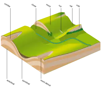 The faisceaux are narrow, elongated deformation zones (up to 100 km long and a maximum of 10 km wide) that separate the plateaus and also form the western boundary of the Jura Massif.[4] They are distinguished from the plateaus, which have a tabular morphology, by significant deformation caused by thrusting and folding of the sedimentary cover.[d 1] The external faisceaux thrust over the peripheral basins, such as the Bresse graben.[26] In the landscape, they appear as elevated reliefs that contrast with the plateaus. Their varied topography results from differential erosion of exposed units, the presence of faults, and the tilting of layers.[a 5] Three groups of faisceaux are distinguished: the western margin faisceaux (five faisceaux), which connect to form a continuous chain; the internal faisceaux (three faisceaux), which separate the plateaus; and the Avant-Monts faisceau, external to the chain and located northwest of the Besançon faisceau.[a 1]
