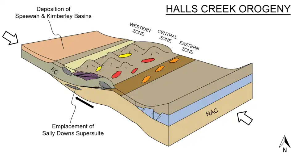 Halls Creek Orogeny is the first mountain-building event that affected all three zones of the Lamboo/Hooper Complex. It was caused by the convergence forces experienced at the plate margins, and eventually began to suture the Kimberley Craton to the North Australian Craton.[2][11]