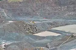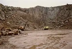 Much of the crushed rock aggregate in the area comes from various layers in the Carboniferous limestone. Higher specification aggregates, such as those required for road surfacing, however, come mainly from sandstones and igneous rocks, both volcanic (BVG) and intrusive (various granitic bodies).[32] Two quarries at Roan Edge (east of Kendal) and Holmscales are currently producing high specification roadstone from sandstone. The single quarry producing very high specification aggregate is at Ghyll Scaur, just north of Millom, which is the only currently available source for this quality of roadstone in England. It works a welded rhyolitic tuff from the Waberthwaite Tuff Formation of the BVG.[33]