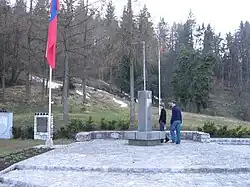The Geometric Centre of Slovenia (Slovene: Geometrično središče Slovenije, GEOSS) is the geometric centre of the country. Its geographic coordinates are 46°07′11.8″N 14°48′55.2″E / 46.119944°N 14.815333°E and its elevation is 644.842 m.[1] It lies in the hamlet of Spodnja Slivna near Vače in the Municipality of Litija. Since 4 July 1982,[2] it has been marked with a memorial stone designed by the architect Marjan Božič, about 50 m away from the given coordinates. A plaque reading Živimo in gospodarimo na svoji zemlji ('We live and prosper upon our land') was added on 14 September 1989.[2] In 2003, Slovenia adopted the Geometric Centre of Slovenia Act, which is a unique case in Europe.[3][4]