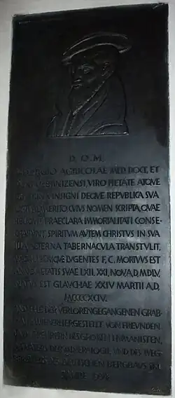 Upon the initiative of his childhood friend, Naumburg bishop Julius von Pflug, Agricola's body was carried off to Zeitz four days later, more than 50 km (31 mi) away, and interred by von Pflug in the Zeitz cathedral.[25] Agricola's wife had a memorial plate commissioned and placed inside, that was already removed during the 17th century. Its text, however has been preserved in the Zeitz annals, and reads: