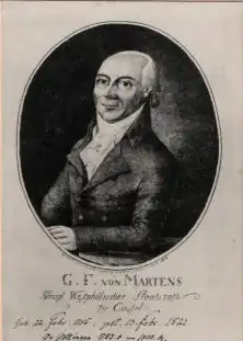 Georg Friedrich von Martens[1] (22 February 1756 in Hamburg, Germany – 21 February 1821 in Frankfurt, Germany) was a German jurist and diplomat. Educated at the universities of Göttingen, Regensburg and Vienna, he became professor of jurisprudence at Göttingen in 1783 and was ennobled in 1789. He was made a counsellor of state by the King of Westphalia in 1808, and in 1810 was president of the financial section of the council of state of the kingdom of Westphalia. In 1814 he was appointed privy cabinet-councillor (Geheimer Kabinettsrat) by the king of Hanover, and in 1816 went as representative of the king to the diet of the new German Confederation at Frankfort.[2]