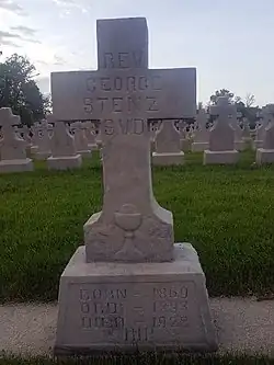 Stenz suffered from a stroke on 17 March 1927, that deprived him of the ability to speak.[2] On 3 May of the same year, he traveled to the USA via Shanghai for recuperation. In Techny, Illinois, he suffered from a second stroke on 21 April 1928, that left him unconscious. He died without having regained his consciousness on April 23.[2] Georg Maria Stenz is buried in the cemetery of the compound of the Society of the Divine Word in Techny.