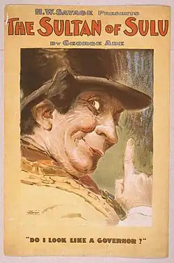 Ade's next show on Broadway was The Sultan of Sulu; an operetta with music by Alfred G. Wathall for which Ade was the librettist.[13] The opera's plot was about the American military's efforts to assimilate natives of the Philippines into American culture.[14] It premiered at Wallack's Theatre on December 29, 1902, in a production produced by opera impresario Henry W. Savage.[15] A popular success, it ran for 200 performances at that theatre; closing on Jun 13, 1903. It then embarked on a national tour which included a return engagement to Broadway in November 1903, this time at the Grand Opera House. The composer Nathaniel D. Mann contributed one song to the operetta, "My Sulu Lulu Loo".[16]