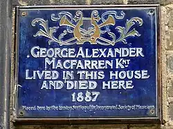 Macfarren was knighted in 1883.[3] He lived with "chronic bronchitis and a weak heart" but refused to abate his working schedule,[13] and died on 31 October 1887, at his house in Hamilton Terrace, St John's Wood.[3] He is buried in Hampstead Cemetery.[14]