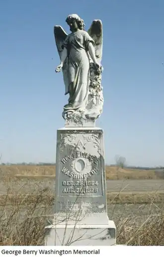 The George Berry Washington Memorial is a monumental funerary sculpture located on Arkansas Highway 149 north of Earle, Arkansas. It is the only major funerary sculpture in Crittenden County, and it commemorates the life and accomplishments of the Rev. George Berry Washington (1864-1928), an African American who was probably born into slavery, but ended his life as one of the county's largest landowners. Washington's grave site is on a low mound in an open field on the east side Highway 149. Two elaborately carved stone piers, 3 feet (0.91 m) in height, flank wide steps leading up to the monument. The monument is a marble statue of an angel 5 feet (1.5 m) in height, mounted on a column of marble blocks 6 feet (1.8 m) high.[2]
