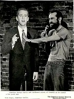 In the 1960s, Carlin began appearing on television variety shows, where he played various characters, including a Native American sergeant, a stupid radio disc jockey, and a hippie weatherman.[32] Variations on these routines appear on Carlin's 1967 debut album, Take-Offs and Put-Ons, which was recorded live in 1966 at The Roostertail in Detroit and issued by RCA Victor in 1967.[32] During this period, Carlin became a frequent performer and guest host on The Tonight Show, initially with Jack Paar as host, and then with Johnny Carson. Carlin became one of Carson's most frequent substitutes during his three-decade tenure. Carlin was also cast as a co-host alongside Buddy Greco in Away We Go, a 1967 CBS comedy-variety show (the summer replacement for The Jackie Gleason Show.[33] His material during his early career and his appearance—he wore suits and had short-cropped hair—was seen as conventional, particularly compared to his later anti-establishment material.[34]