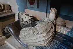 After Naseby, the city was captured for the second time, the forces this time led by Colonel John Birch. Birch and Colonel Morgan took a number of people captive on 8 December 1645, including Coke, Judge Jenkins, Sir Henry Bedingfield, Sir Walter Blunt, Sir Henry Miller, Sir Marmaduke and Sir Francis Lloyd, Giles Mompesson, Sir Nicholas Throgmorton, and others who were initially taken to Gloucester. On 3 January 1646, Coke and others were ordered to London by the Commons and many were sent to the Tower on the 22nd to answer charges of high treason.[14] Birch rifled the bishop's palace and afterwards took up his habitation there until the Restoration. Moreover, he had a great part of the revenues of the diocese to his own use, and John Walker complained in 1714 that "to this day, the manor of Whitborn, by the sorry compliance of some who might have prevented it, continues in his family".[15] Coke's estate of Queest Moor was sequestred on 13 August 1646, and despite his always frugal habits, he was forced to rely on the charity of other family members.[2] He was deprived of his See of Carlisle by Parliament on 9 October 1646, as episcopacy was abolished for the duration of the Commonwealth and the Protectorate.[16][17] Coke died on 10 December 1646, at either Quedgeley, Gloucestershire,[1][6] or Eardisley[2] and was buried in Eardisley parish church.[1][2][6] After the Restoration of 1660, a handsome cenotaph was erected to his memory in Hereford Cathedral, which was much altered in the 19th century.[1][2]