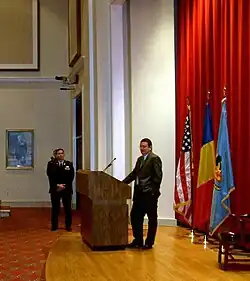 After graduating with a Master in 1992, he worked as a diplomat in the Romanian Foreign Affairs Ministry,[8] between 1997 and 1999 being appointed as chargé d'affaires at the Romanian Embassy in Ireland. After the Social Democrat Party won the election, George Maior was appointed as State Secretary and Head of the Euro-Atlantic and Defense Policy Department of the National Defense Ministry.[9] From this position, he led the NATO[10] accession negotiations, concluding with a successful active integration[11] of Romania in the Alliance and the signing of several contracts for the acquisition of military equipment (2 frigates and numerous flying equipments). On August 24, 2004 he received the diplomatic rank of Ambassador.