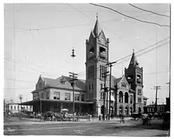In November 1902 Dickey was awarded a contract to design Houston's fourth City Hall, the previous three all having been destroyed by fire.[3] Dickey based his design, featuring two towers for a clock and bell, on the previous city halls, but Dickey designed the stone and brick building in a Victorian Romanesque style which was outdated.[3] The building was completed in 1904.[3] In 1939, the city government moved to a new building on Bagby Street, and the building was destroyed by fire in 1960.[4]