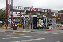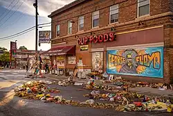 As a reaction to the murder of George Floyd on May 25, 2020, racial justice activists and some residents of the Powderhorn community in Minneapolis staged an occupation protest at the intersection of East 38th Street and Chicago Avenue with a blockade of the streetway lasting over a year.[5][6][7] The intersection is where Derek Chauvin, a white police officer with the Minneapolis Police Department, murdered George Floyd, an unarmed 46-year-old Black man.[8] Activists erected barricades to block vehicular traffic and transformed the intersection and surrounding structures with amenities, social services, and public art depicting Floyd and other racial justice themes.[2][9][7] The community called the unofficial memorial and protest zone at the intersection "George Floyd Square". The controversial[10] street occupation in 2020 and 2021 was described as an "autonomous zone" and a "no-go" place for police,[11] but local officials disputed the extent of such characterizations.[12][13]