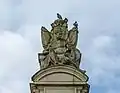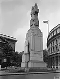 During World War I Frampton used his position in various art societies and institutions to expel any German members he considered potential "enemy aliens". When the Art Workers Guild refused to expel Karl Krall, a British citizen born in Germany, Frampton resigned from the Guild.[19] In 1915, Frampton was commissioned to create a public memorial to Edith Cavell. Having waived his fee for the work, Frampton's modernist style monument in marble and granite was unveiled to huge crowds near Trafalgar Square in central London during 1920.[22] The severe, modern appearance of the memorial is distinct from Frampton's earlier, more heroic style of Boer War memorials and was criticised as such.[23] Several contemporary sculptors also criticised the design and the engineering of the monument.[22]