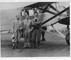 ![]() Ryan corp. group photo, left to right A.j. Edwards, F.W. Hemingway, George H. Prudden, standing in front of the Prudden TM-1 tri-motor airliner. | |