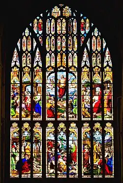 - An east window for the chapel of Jesus College, Oxford (1853)[4] This shows various biblical episodes, including three instances of Christ raising people from the dead: Jairus' daughter, the son of the widow of Nain and Lazarus.[5] There are also pairs of scenes from the New Testament and the Old Testament to demonstrate the typological relationship between them: for example, the Passover is paired with the Last Supper, Jonah escaping from the whale with the Resurrection of Jesus, and the ascension of Elijah with the ascension of Jesus.[6] Nikolaus Pevsner described it as "a busy, somewhat gloomy piece with many small scenes".[7]