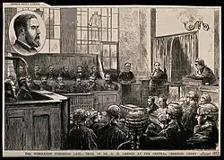 Lamson was tried at the Old Bailey in March 1882 before Mr Justice Hawkins and a jury; Montagu Williams acted for his defence: he was found guilty of murdering Percy in order to secure his share of the family trust fund, some £3,000 which Percy would have inherited on coming of age. He had poisoned his victim with aconitine in the cake, a substance which Lamson had learned about from Professor Robert Christison at Edinburgh University. Christison had taught that aconitine was undetectable, but forensic science had improved since Lamson's student days and the poison was easily identified, as well as Lamson's purchase of it from a London pharmacist.[5][6][7]