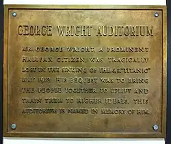 George Henry Wright (October 26, 1849 – April 15, 1912) was a significant businessman and philanthropist in Halifax, Nova Scotia. He was born at Wright's Cove, Nova Scotia and died in the sinking of the Titanic at the age of 62. He established Write's World Business Directory in Boston and later returned to Halifax and invested in the city. His own house at 989 Young Ave, and two of his public buildings, the Marble Wright Building (1672 Barrington St.) and The Saint Paul Building, (1684 Barrington St., formerly the home of JW Doull's bookstore) still stand in downtown Halifax. They were all built by architect James Charles Philip Dumaresq.[2]