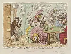 The Loss of the Faro Bank (1797), by James Gillray. Lord Buckinghamshire brings the news that the Faro bank has been stolen, to gamblers including his wife, popularly thought to exploit the gullible.[5]