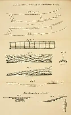 - ...the first method consists in the use of either solid dams or barriers permeable to water extending from the shore to the channel, for the double purpose of directing the latter into its desired course and accumulating sediment at its sides. The result looked for is a contraction of the river bed to the required limits, but [multiple] objections may be urged against this plan...[7]