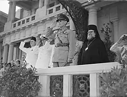 In occupied Greece, however, the leftist partisans of the National Liberation Front (EAM) and National Popular Liberation Army (ELAS), now unfettered by Metaxas's oppression, had become the largest Greek Resistance movement, enjoying considerable popular support. As liberation drew nearer however, the prospect of George's return caused dissensions both inside Greece and among the Greeks abroad.[178][179] Although he effectively renounced the Metaxas regime in a radio broadcast, a large section of the people and many politicians rejected his return on account of his support of the dictatorship. In November 1943, George wrote to Tsouderos, "I shall examine anew the question of the date of my return to Greece in agreement with the Government". Either deliberately or accidentally, the version released for publication omitted the words "of the date", creating the impression that George had agreed to a further plebiscite on the monarchy, even though a retraction was issued.[180] After Italy joined the Allies on 8 September 1943, communists in Greece seized weapons of the Axis and gained territorial power within the country.[181] There were growing calls for George to hold a referendum and appoint a regent before he returned to Greece. It was suggested that the regent be the Archbishop of Athens and All Greece, Archbishop Damaskinos, who was a strong supporter of republicanism, and thus George heavily opposed this. Communists became the monarchy's main political opponent and a rival communist-led government, called the Political Committee of National Liberation, was established in occupied Greece and a pro-EAM mutiny, the 1944 Greek naval mutiny, among the armed forces in the Middle East, occurs.[182] On 8 April 1944, Tsouderis resigned and George appointed the liberal Sophoklis Venizelos. However, when Venizelos is discovered to have been involved in the mutiny, George appoints Georgios Papandreou as prime minister and Papandreou selects a Cabinet made up of multiple republican ministers. It was agreed in the May 1944 Lebanon conference that the fate of the monarchy would be decided in a national referendum.[183] George was very much opposed to a regency, and tried his best to turn Churchill against Archbishop Damaskinos, accusing him of being a communist and a Nazi collaborator.[184]