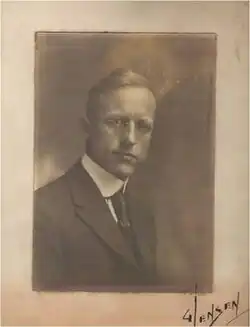 George Jensen (August 9, 1878 – October 4, 1977) was an artist of Danish descent born in Port Clinton, Ohio. Jensen was best known for his Midwest and New England landscape and seascape oil paintings as well as for his artistic versatility producing numerous works from water colors to linoleum block.[1][2][3][4][5] Jensen often traveled to Michigan (Saline, Marquette, Presque Isle), New York, Pennsylvania, Ohio, West Virginia, and Massachusetts (Cape Cod, Provincetown) and compiled sketches which he would later transcribe to canvas.[1][3][6] The Upper Peninsula of Michigan is where he would paint seascapes of black rocks and waves that would "wash 15 feet high" off Lake Superior.[1][3]
