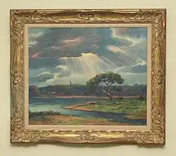 Jensen's artwork has been exhibited in a number of large cities throughout the United States; most notably Toledo, Ohio, where he was credited to have "been an important figure in the cultural life of the city".[5][7] Jensen, best known for his oil paintings, began his art career in watercolor, linoleum block, as well as pen and ink.[5] In 1912, he became one of the first artists to host a solo-exhibition at the Toledo Museum of Art one year after the building opened on Monroe St. in Toledo, Ohio.[2][5][7] Jensen participated in exhibitions in a number of museums including the Brooklyn Museum of Art (1932, 1936), Detroit Artist's Exhibit (Detroit, Michigan), the Butler Institute of American Art (Youngstown, Ohio), the Columbus Museum of Art (Columbus, Ohio) and the Fort Wayne Museum of Art (Fort Wayne, Indiana).[2][5][7][8] Other US cities where George Jensen's art has been exhibited include: Sylvania, Ohio; Bowling Green, Ohio; Philadelphia, Pennsylvania; New York, New York; Cleveland, Ohio; Minneapolis, Minnesota; and others.[5][7][9] In addition to painting and teaching, for 20 years Jensen worked commercially as an artist for Jennison-Wright, Willys-Overland, Conklin Pen Co., Medbury-Ward Co, Webb C. Ball Co, as well as many other national publications.[2][4][5][6][7][10] However, as the depression slowed commercial progress, Jensen kept busy by shifting focus to landscape and seascape art which he preferred. In 1954, he celebrated the 40th anniversary of his first "one-man art show" held at the Toledo Museum shortly after the building was constructed with an additional exhibit of 20 paintings held at the Toledo Museum of Art.[2] Jensen was a member of a number of prominent artist groups including the Scandinavian Art Society of New York, the Society of Independent Artists, the Toledo Artists Club (lifetime member). By 1962, he had contributed works to the Saturday Evening Post, Time, the Ladies Home Journal, and a host of trade journals.[4][6][10] By 1963, the Toledo Area Artist group had sponsored 45 annual art exhibitions to nearly all of which Jensen contributed.