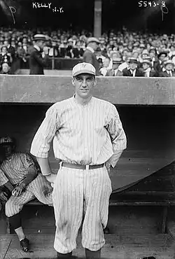 Finding success in Rochester, Kelly was purchased by the Giants in 1919 when Hal Chase was suspended.[2] He became a regular in the Giants line-up in 1920, when he had a league-leading 94 runs batted in (RBI).[1] He led the league in assists and putouts in 1920 and 1921; his 1,759 putouts in 1920 remains a league record.[2] Kelly batted in 100 or more runs for four consecutive seasons and hit for a batting average of .300 or higher six consecutive seasons.[1] He opened the 1921 season with at least one hit and one RBI in eight consecutive games, a record that stood until it was broken by Jorge Cantú in 2010.[10] The Giants appeared in the World Series in 1921, 1922, 1923, and 1924, winning in 1921 and 1922. Kelly set a National League record with seven home runs in six consecutive games in 1924, which has since been matched by Graig Nettles, Walker Cooper, and Willie Mays.[11]