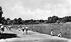 In the 1929 general election Labour emerged as the largest party, with 287 seats—but without an overall majority.[116] Once again, MacDonald formed a government dependent on Liberal support. Lansbury joined the new cabinet as First Commissioner of Works, with responsibilities for historic buildings and monuments and for the royal parks. This position was widely regarded as a sinecure;[117] nevertheless, Lansbury proved an active minister who did much to improve public recreation facilities.[4] His most notable achievement was the Lido on the Serpentine in Hyde Park; according to the historian A. J. P. Taylor "the only thing which keeps the memory of the second Labour government alive".[118] A circular memorial plaque to Lansbury can be seen on the exterior wall of the Lido Bar and Cafe. Lansbury's duties brought him into frequent contact with the King, who as Ranger of the royal parks insisted on regular consultation. Contrary to the expectations of some the two formed a cordial relationship.[119][120]