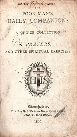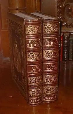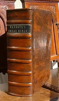 George's brother, Thomas, was the Bible's publisher. Production began in 1811 and was completed in 1814, in a large, folio edition.[6] As were many editions of the Bible at the time, Haydock's was published and sold by subscription, a few leaves at a time. Subscribers would accumulate the sets of leaves over the years and ultimately have the completed Bible bound. Different copies have general title pages dated 1811, 1812, 1813 or 1823,[7] showing variously Thomas Haydock's Manchester or Dublin locations. English Catholics enthusiastically welcomed this impressive volume that symbolized a reinvigorated Catholicism on the verge of winning its long fight to repeal the Penal Laws. At least 1,500 copies of the first edition were sold.