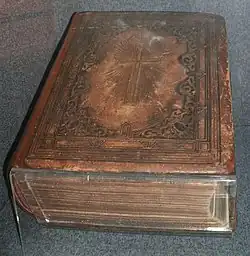 - ca. 1853: a quarto edition by George Henry and Co. of London, and initially distributed in America by George Virtue of New York. In this edition, the commentary was abridged by Canon F. C. Husenbeth (1796–1872). This was probably the most successful of the Haydock editions, remaining in print through the rest of the century. Circa 1880, The National Publishing Company of Philadelphia imported the stereotype plates from England and mass marketed editions over the imprints of a wide range of local booksellers and printing companies, and even got the recently established Montgomery Ward national mail order firm to include it in their catalogue. An extraordinarily large number of copies must have been printed, judging by how frequently surviving copies are met with in the second-hand book trade. A copy of this edition was used in the Inauguration of President John F. Kennedy (1917–1963) in 1961, coincidentally the 150th anniversary of Haydock's first edition. Another copy was used in the inauguration of President Joe Biden.