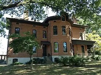 The George M. Brinkerhoff House is a historic house located at 1500 North 5th Street in Springfield, Illinois. Businessman George M. Brinkerhoff commissioned the house in 1869; it was completed the following year. Architect Elijah E. Myers designed the Italian Villa style house. The 2+1⁄2-story brick house features a Gothic-inspired tower on its southwest corner; the tower was originally four stories tall but was shortened in 1960. The house's design includes angled porches, brick quoins on the corners, bracketed eaves, a dentillated cornice, and Myers' signature ornamental rope trim. After Brinkerhoff died in 1928, Springfield College bought the house to serve as its main building.[2]