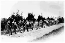 George M. Hendee took up bicycle racing at age 16. He won the United States National Amateur High Wheel Championship in 1886, setting a new world record over a dirt half-mile track of 2 minutes 27.4 seconds, which he held until 1892.[2] Hendee was America's first national cycling champion, winning 302 of the 309 races he entered and dedicating himself to racing and traveling to bicycling events.