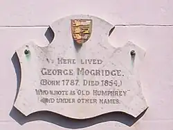 In 1851 Mogridge sprained his ankle and during his convalescence fell into a further spell of the bad health which had dogged him for much of his life.[5] On medical advice he left London and took a house at 6 High Wickham, Hastings, Sussex, where he lived for the rest of his life, and he grew to love the town, writing Old Humphrey at Hastings during his time there.[5] He died, with his wife at his bedside, in Hastings on 2 November 1854, and, by his own request, was buried against the wall in the graveyard of All Saints' Church, Hastings. His gravestone stresses his religious convictions. The Religious Tract Society estimated that they had sold more than 15 million copies of his works worldwide by the time he died,[2] and many of his Tracts are still in print today.[1]